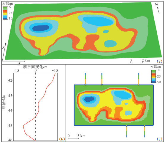 断陷湖盆中心充满沉积物,中心地层较厚而边缘较薄,因此厚度变化趋势可以反映水深变化趋势[25]。厚地层表示相对深水,砂泥比较小;薄地层表示浅水,砂泥比较大。结合陆丰22洼古水深,最终得到该模型SQ3层序的基底初始水深图(图 6a)。湖平面变化对可容空间也有影响,研究区文昌组SQ3到SQ4层序沉积期湖平面变化频繁,整体呈先上升后下降的变化趋势(图 6b)。