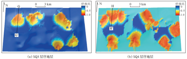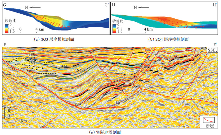 SQ3层序沉积期,湖盆可容空间大,物源来自北部和东南部,供给相对充足,A/S >1;洼陷北部发育三角洲,从边界断层向湖盆内部呈扇形分布,含砂量向洼陷内明显降低,过渡为湖相泥岩(图 7a);边缘沉积体呈下超充填特征,且前积迁移轨迹表现为向湖盆内部、向上迁移的特征,砂体沉积厚度较大,模拟结果剖面与实际地震剖面特征具有较高的一致性(图 8)。SQ4层序沉积期,湖盆逐渐被充填,构造活动减弱,可容空间变小,物源供给充分,A/S ≤ 1,三角洲砂体分布范围广(图 7b),该时期三角洲砂体呈斜交充填特征,且前积迁移轨迹具有向水平、向下迁移的特征,三角洲砂体向前推进,厚度逐渐减小(图 8)。