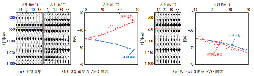 将正演模拟道集(图 2a)和AVO响应校正前、后的井旁地震道集及对应的AVO响应进行对比分析。原始叠前道集及AVO曲线(图 2b)显示目标储层为第Ⅳ类AVO响应,这与正演道集储层为第Ⅲ类AVO响应相矛盾。产生这一结果的原因是研究区新近系地层为高孔隙度欠压实地层,且受浅层气、复杂断裂等因素的综合影响,地层吸收衰减作用明显,使地震道集中远炮检距的能量迅速减弱,保幅性变差,因此原始叠前道集无法满足后续基于AVO规律的叠前分析和反演的要求。三维校正因子补偿后的道集及AVO曲线(图 2c),显示目标储层为第Ⅲ类AVO响应,与正演模拟道集的储层AVO响应特征一致,该校正方法较好地恢复了叠前道集的真实AVO规律,这一结果为基于AVO规律的叠前技术在渤海油田广泛应用提供了可靠的基础资料。