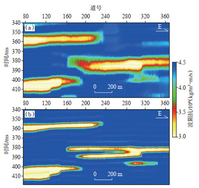 下载原图 图 6 渤海海域垦利6-1油田常规反演(a)与分频随机反演(b)储层预测波阻抗属性的平面分布对比 Fig. 6 Comparison of impedance attributes in reservoir prediction between conventional inversion(a)and frequency-divided stochastic inversion(b)in Kenli 6-1 oilfield, Bohai Sea |