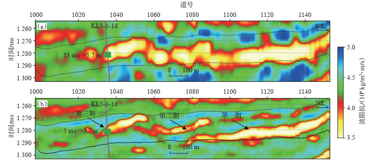 下载原图 图 5 渤海海域垦利6-1油田垦利5-1-1 d井常规反演(a)与分频随机反演(b)储层预测剖面对比 Fig. 5 Comparison of reservoir prediction profiles between conventional inversion(a)and frequency-divided stochastic inversion(b)of well Kenli 5-1-1 d in Kenli 6-1 oilfield, Bohai Sea |