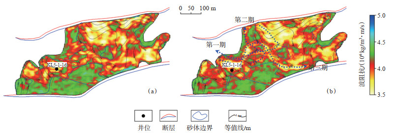 研究区垦利5-1-1d井在新近系明下段1395砂体钻遇厚5.7 m的油层,在常规反演结果中表现为点状分布,无法确定统一的砂体描述准则,钻前难以进行有效刻画(图 5a),而基于分频随机反演方法得到的储层预测结果则有效地反映了该砂体为多期砂体叠置,从剖面上可以看出3期砂体的发育情况和叠置关系(图 5b)。分别采用常规反演和分频随机反演方法对该区砂体平面展布进行预测,结果显示常规反演结果中河道为断续强反射,整体河道特征不明显(图 6a),而分频随机反演预测结果中,河道特征明显,3期河道接触关系更加清楚(图 6b)。三维砂地比约束分频迭代随机反演在渤海油田莱北地区的成功应用,也证明地球物理反演技术的创新实现了对薄互层砂体期次的“平面定性分析”到“平剖三维空间综合判别”的进步。