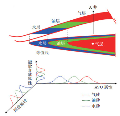 通过综合分析不同属性参数可知,能量衰减、厚度和AVO属性是研究区明下段流体检测结果的主控因素。因此,可以利用这3个相对独立的属性参数构建三维空间,通过三维坐标旋转技术获得特定角度的空间流体识别矢量。该矢量经过岩石物性散点的质心,可代表新的属性组合参数,且能达到最佳的油水区分效果,这一新的属性组合参数便为三维流体识别因子,其中坐标旋转角度由流体因子异常与构造高低的匹配程度为准则进行寻优确定(图 7)