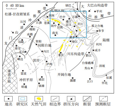 1 地质概况研究区川东北包括四川境内的阆中、仪陇、营山、万源、宣汉、达县、开江、梁平、城口、南江、旺苍和广元,面积约4.38×104 km2(图 1)。研究区在构造区划上位于上扬子地台的北东部,现今构造格局主要受北西向的米仓山—大巴山巨型构造山系逆冲推覆作用控制,经历了中、新生代复杂的构造演化过程,具有被3个构造系夹持的复杂区域构造复合体系。北西向与松潘—甘孜褶皱系(龙门山逆冲退覆带)相邻,北东临秦岭—大巴山构造带,南东临川东构造带,地理上属于四川盆地东北部和部分渝北地区的山区。