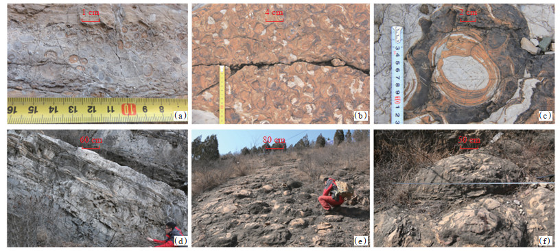 下载原图 图 10 北京门头沟中、晚元古代白云岩中的核形石和叠层石 (a)核形石,产于白云岩中,竖直面,昌平组,门头沟苇子峡;(b)叠层石,雾迷山组,九台山庄;(c)叠层石,灰白色部分为白云岩,黑色部分为硅质岩,雾迷山组,九台山庄;(d)叠层石,产于白云岩中,见少量硅质岩,九台山庄东3 km;(b)叠层石,半球形,直径为50~60 cm,最大达120 cm,产于白云岩中,门头沟某地219国道北侧;(f)叠层石,半球形,直径120 cm,产于白云岩中,门头沟某地219国道北侧。 Fig. 10 Oncolites and stromatolites in dolomite of Middle and Late Proterozoic in Mentougou, Beijing |