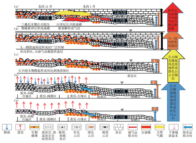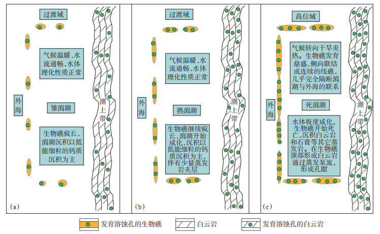 白云岩的形成是多种有利的地质因素“共振”的结果。生物礁发育在开江—梁平海槽东部形成负反馈,长兴早期,海域开阔,海水对流畅通,气候温暖,在台缘(包括台内)开始发育点礁,礁后的瀉湖水质与外海基本一样,但水动力能量较弱,沉积了灰泥(还有叠层石、核形石等)(图 11a);至早长兴期末期生物礁快速生长,侧向开始连接成线礁(图 11b),瀉湖水流受到限制,由于气候干旱炎热,瀉湖水体开始咸化,以灰泥沉积为主,偶尔沉积白云质;至长兴组中后期生物礁继续发育,侧向连接成完整的线礁,使瀉湖水体与外海几乎完全隔断,加上气候转向干旱炎热,瀉湖水体极度咸化和毒化(图 11c),生物礁生长中止。在特大潮期和雨季,瀉湖水得到补充,但由于密度小,主要分布在上部。由于水体咸度高导致密度加大,并且出现密度分层,瀉湖底部的水密度大于顶部,所以瀉湖水会向生物礁下部或底部渗透,尤其是Mg2+会向生物礁扩散,导致白云石(岩)化。与此同时,咸化和毒化的瀉湖水向生物礁和外海扩散,导致生物礁“死亡”,于是生物沉积终止,代之而起的是纯化学沉积,因此白云岩便成了生物礁盖。