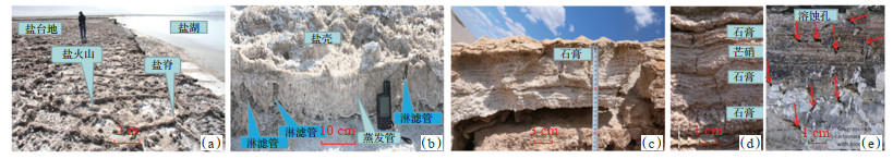 下载原图 图 13 现代盐湖蒸发泵流形成的盐壳 (a)右侧为盐湖,盐水呈饱和状态,左侧为盐壳,坚硬如石,埋藏后可以抵御很强的上覆沉积物的压力,为保存原生孔隙创造了一定的条件,盐壳上发育大量盐裂、盐火山和纵向微孔,高出湖面80~100 cm,青海大柴旦;(b)盐壳的内部结构,可见大量直径毫米级、高数厘米的竖直蒸发管,是蒸发泵流的“发动机”,为蒸发泵流提供了动力条件,可见雨水淋滤形成的淋滤管,青海大柴旦;(c)石膏,薄层状,层厚为0.5~1.0 cm,石膏晶体直立,晶间孔发育,坚硬如石,第四系,罗布泊;(d)石膏、芒硝,薄层状,石膏晶体直立,小晶间孔发育,被红色泥充填,芒硝极薄层状,厚数毫米,均是年沉积纹层,水下沉积形成的,坚硬如石,第四系,罗布泊;(e)现代碳酸盐软泥层内发育了大量溶蚀孔,潜在的储集空间,卡塔尔现代萨博哈。 Fig. 13 Salt crust formed by evaporation pumping in modern salt lake |