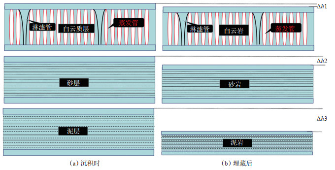 在表生条件下,蒸发泵流作用使蒸发岩在水面之上完成了化学胶结而变得的十分坚硬,在埋藏成岩阶段可以抵抗压实而最大限度地保存孔隙。图 14定性地展示了3种不同的沉积物经埋藏压实后的厚度变化,可见白云质沉积的厚度变化最小(Δh1),在深度为1 km左右时,70%~80% 的孔隙能够保留下来;沉积初期的砂层,孔隙度大(30%~35%),埋藏压实后的砂岩厚度大幅减小(Δh2),孔隙大部分损失;沉积初期的泥层,孔隙度极大(50%~60%),含水量极高,经埋藏压实后的泥岩厚度大幅减小(Δh3),原生孔隙基本消失。