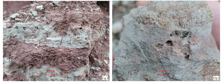 下载原图 图 15 四川盆地大足遂宁组泥质白云岩与灰质白云岩照片 (a)棕红色薄层粉砂质泥岩与灰绿色薄层灰质白云岩互层,白云岩中发育大量溶蚀孔洞,大者直径为0.5~1.5 cm;(b)灰绿色薄层灰质白云岩,发育溶蚀孔洞,直径为1.5 cm,具有很好的连通性。 Fig. 15 Photos of argillaceous dolomite and calcareous calcite dolomite of Suining Formation in Dazu, Sichuan Basin |