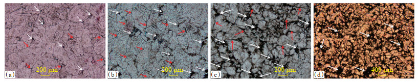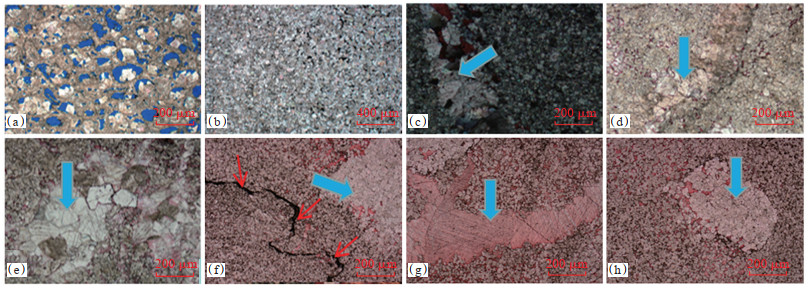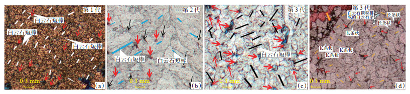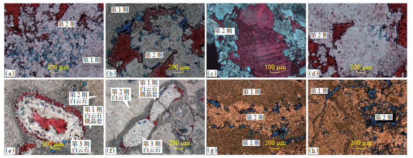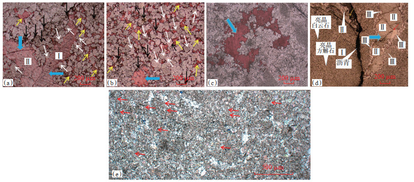 通过镜下观察,可区分出3代白云石(图 18):第1代同生或准同生,他形粒状为主,可能与溶蚀或搬运磨蚀有关,主要以单个白云石颗粒为主,少量由3~5个白云石颗粒组成的短棒,粒间孔较发育(红色箭头)。第2代白云石,他形晶粒,晶体呈颗粒状或由3~5个白云石颗粒组成的短棒状(0.005 mm×0.015 mm),偶见长棒状晶体。白云石“颗粒”非常拥挤,岩性致密,孔隙不发育可见6个较大的残留孔(红色箭头),被方解石充填,可能是未被完全交代的方解石残余。成岩改造主要受原生沉积控制,只有蒸发泵流作用下形成的白云质沉积才能在成岩过程中继续保持良好的物性且形成新的储集空间。第3代白云石晶体粗大,以细晶—中晶为主,半自形—他形,粒径为0.15~0.50 mm。