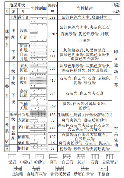 四川盆地地层发育齐全、厚度大,具有多层系、多旋回的特点。盆地边缘主要分布元古界和古生界,大凉山、龙门山、米仓山还出露中酸性和基性、超基性岩浆岩;在华蓥山背斜核部局部出露古生界;中生界遍及盆地内部;新生界主要分布在成都平原及现代河流的两岸。盆地基底为前震旦系,局部地区还包括下震旦统,主要由一套变质岩及岩浆岩组成,厚度达万米级,属中上元古代。基底上覆沉积盖层在盆地内均有发育,总厚度为6~12 km。震旦系到中三叠统为海相沉积,以碳酸盐岩为主,厚度为4~7 km;下震旦统在盆地内缺失,只在川东北、川东南等凹地有沉积;上震旦统在全区发育良好,岩性变化小,分布稳定;寒武系、奥陶系及志留系在盆地内分布范围广,后期受加里东运动影响,中、上寒武统和奥陶系在成都以南局部地区遭受剥蚀,奥陶系仅残留了桐梓组,厚度仅为53 m;志留系剥失范围更大,在川东北地区几乎缺失,仅在城口庙坝的双河镇和中坝的文采村偶有发育,岩性为变质碎屑岩。