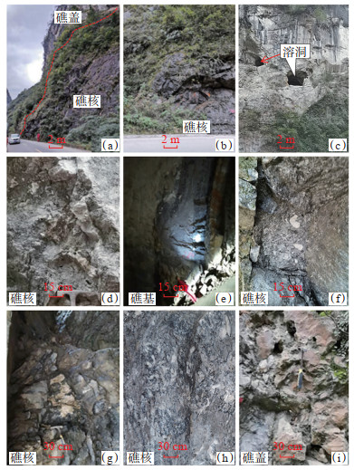 2 长兴组生物礁与气藏 2.1 露头生物礁与礁盖白云岩中国南方二叠系生物礁比较发育[15-16],川东北长兴组生物礁是其中之一,也是本次研究的重点。在川东北长兴组生物礁露头发育较好,最好的剖面位于宣汉盘龙洞一带。长兴组生物礁大致可分为下部灰岩段(礁灰岩段)和上部白云岩段,厚度为25~ 400 m。台地边缘的普光5井区长兴组地层厚度达520 m,但没有发育生物礁。天然气仅发育在长兴组上部的白云岩和溶洞中。台地边缘的毛坝3井区长兴组地层厚度达500 m,可能是受北东向生长断层的控制。长兴组下段为灰—浅灰色、深灰色中厚层至块状泥微晶灰岩,含砂屑泥晶灰岩、砂屑灰岩、条带状灰岩、生物碎屑灰岩、硅质白云岩,局部发育硅质白云岩团块。在研究区的盘龙洞(图 3a—3d)和羊鼓洞(图 3e—3i)地层剖面中,长兴组下部发育生物礁灰岩和生屑灰岩,造礁生物以海绵类和藻类为主,附礁生物包括棘屑、蜓类、腕足类等。长兴组上段厚度为100~200 m,主要为灰色、灰白色中厚层至块状礁云(灰)岩、砾屑白云岩、泥微晶白云岩和晶粒白云岩,该段地层富含生物化石,造礁生物与附礁生物发育,且多见沥青(图 3f—3h),白云石化作用强烈,主要对骨架礁、粘结骨架礁和部分生屑滩相灰岩白云石化,并形成大量的溶蚀孔洞,且充填方解石、白云石、沥青等(图 3i)。总之,长兴组在川东北的岩性及其沉积厚度变化较大,揭示其沉积环境在区域内变化较大。