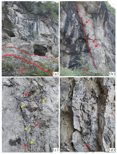 吴熙纯等[17]、马永生等[18-21]、周刚等[22-23]、李小燕等[24]、黄仁春等[25]均对川东北长兴组生物礁进行了研究,但对生物礁顶部的白云岩的关注较少。在宣汉鸡唱村—盘龙洞—羊鼓洞生物礁剖面上可见礁核的上部和顶部均发育一套白云岩,且具如下特点:①礁顶白云岩与礁核呈不整合接触,礁核内部也存在不整合接触面(图 4a,4b),在不整合接触面上可见砾石和明显的接触“缝”,是流体的良好运移通道和储集空间;②礁顶白云岩发育多尺度溶孔,偶见直径达2 m的大型溶洞,为良好的储集空间;③部分礁顶白云岩内发育白云岩砾石(图 4c,4d),粒径多为数厘米,揭示白云岩层在形成过程中可能发生垮塌或被流水搬运;④礁顶白云岩的厚度为零到数十米不等,揭示其受底形和微相控制,也进一步揭示礁顶白云岩储层在空间上变化剧烈,甚至在一些地区不发育。