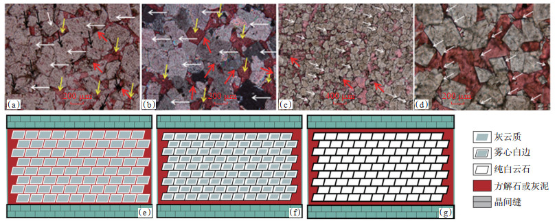 方解石在白云岩化过程中,岩石体积缩小,Weyl[30]认为体积减小12%~13%;黄成刚等[31]通过精密物理推算和实测验证后认为理想状态下方解石转化为白云石体积会减小11.78%~13.36%,且该数值随着白云石中含铁量的不同而存在小幅波动。白云岩化过程中,白云石与方解石之间会形成一系列自生缝或自生孔,沉积形成的白云岩往往不纯,含有灰质或有机质。在成岩过程中方解石、灰质白云石和含有机质的白云石等会不断地转变成纯白云石,导致体积缩小,形成晶间孔(图 7a)和晶间缝(图 7b—7d),方解石转变为白云石时发生紧密堆积,这种收缩率对碳酸盐岩、尤其是对深部碳酸盐岩的储集能力产生至关重要的影响。收缩缝的宽度为0.001~0.010 mm,长度(不考虑不同晶体之间的联结)多为0.01~0.05 mm,与一个晶体的长宽相同(图 7e),收缩缝总体宽度较均匀,局部存在差异,甚至与溶蚀孔联结(图 7a,7b的白色箭头所指)。白云石晶体的成岩收缩缝作为最末级的储集空间,其单缝的储集能力有限,但数量很多,散布于各个白云石晶体之间,而且彼此连通成孔缝网络(图 7f,7g),对于改善渗透能力极为有用。在川东北罗家寨2井的飞仙关鲕粒云岩中可见明显的收缩孔缝,不排除有的收缩缝受到溶蚀而扩展,但这种缝首先是因为成岩收缩而产生的。史建南等[32]认为川东北长兴组白云岩主要是成岩过程中形成的;郑荣才等[14]根据原始物质和结构保存状况、白云石晶体大小、晶形、结晶程度和充填物等特征,将长兴组白云岩储层的埋藏白云岩化过程划分为3个成岩阶段和6个期次,此次研究在研究区内观察到3个期次的白云石。
