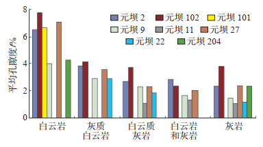 下载原图 图 8 川东北元坝气田二叠系长兴组白云岩与灰岩的孔隙度对比[10] Fig. 8 Comparison of porosity between dolomite and limestone of Permian Changxing Formation in Yuanba gas field, northeastern Sichuan Basin |