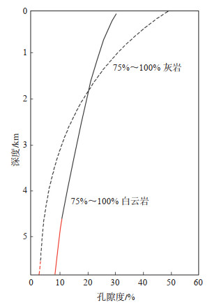 下载原图 图 9 白云岩与灰岩的深度与孔隙度关系(据文献[36]修改) Fig. 9 Relationship between depth and porosity of dolomite and limestone |