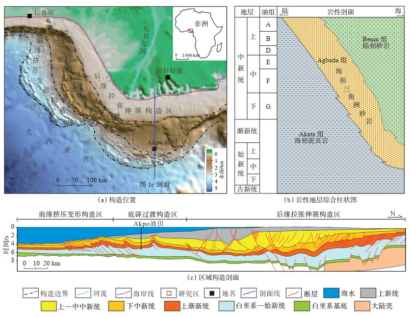 1 地质概况Akpo油田位于西非尼日利亚西南海域的尼日尔三角洲盆地,区域水深超过1.5 km,该盆地自北向南(由陆至海)可划分为后缘拉张伸展构造区、底辟过渡构造区和前缘挤压变形构造区等3个构造带[12-13],Akpo油田位于底辟过渡构造区(图 1)。尼日尔三角洲盆地的沉积物主要来自于尼日尔-贝努埃水系,自始新世起,尼日尔-贝努埃水系携带的大量陆源碎屑在西非大陆架—上陆坡部位持续卸载,形成了厚度为9~12 km的三角洲沉积建造[14]。尼日尔三角洲是一个典型的进积型海相三角洲,自下而上发育Akata组海相泥岩、Agbada组海相三角洲砂岩和Benin组陆相冲积砂岩等3套穿时岩性地层单元[11]。Akpo油田主要含油层系为下中新统—上中新统的Agbada组海相三角洲砂岩,自上而下划分为A,B,D,E,F,G共6个油组,其中D油组处于下陆坡位置,形成于整个进积期的中晚期,砂体呈席状展布,横向延伸距离超过10 km,储层厚度约15 m,宽厚比大于600,为典型的深水复合朵体沉积。