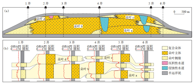 该类型水道长期处于活动状态,主要作为向下陆坡—盆底输送物源的通道,以侵蚀作用为主,基本不发生沉积作用,废弃后被半远洋泥所充填,测井曲线突变位置与泥岩基线重合(图 7c),这种现象与陆相湖盆斜坡发育的重力流废弃河道充填特征类似[20]。侵蚀性水道会对下伏朵叶形成不同程度的侵蚀,进而影响储层侧向连通性。