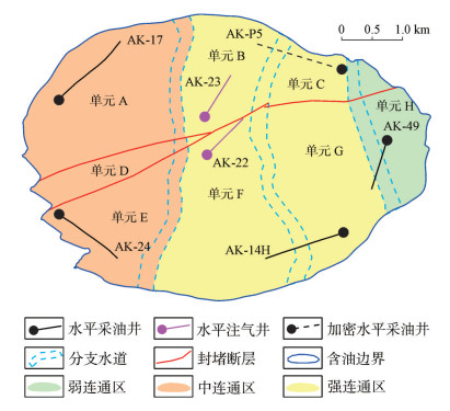 5 应用效果尼日尔三角洲盆地Akpo油田中新统D油组为挥发性油藏,采用“边部采油、顶部注气”的方式进行开发,2009年投产,现有4口水平采油井,2口水平注气井。基于D油组沉积单元划分及储层叠置模式的认识,结合断层封堵性分析,将D油组细分为8个开发单元(图 11),根据单元内注采井部署情况及生产动态,指导生产制度优化及调整井位部署。