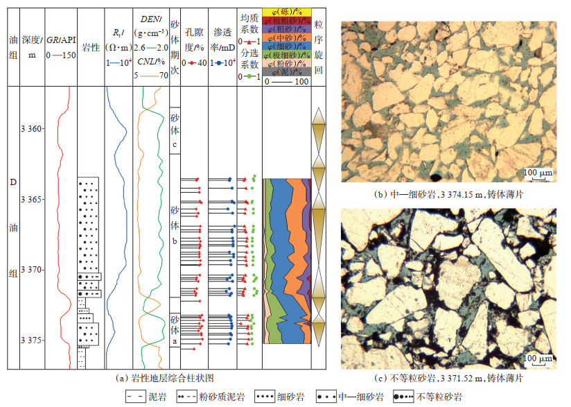 (1) 岩性特征。砂体a有效厚度为2.4 m(图 2a),岩性以中—细砂岩为主(图 2b),细砂的体积分数超过70%,中砂的体积分数约15%,粗砂的体积分数仅为3%;砂体b的有效厚度为10.2 m,以中—细砂岩为主,底部可见不等粒砂岩(图 2c),细砂的体积分数平均约47%,中砂的体积分数约31%,粗砂的体积分数约17%,从粒度构成看,砂体b粒度相较砂体a更大。
