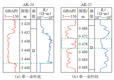 2.2 沉积单元界限标志为进一步将深水复合朵体细分方案由取心井推广至非取心井,利用测井资料建立了D油组深水复合朵体内部单一朵叶的界限标志,同时,利用地震资料建立D油组深水复合朵体内部分支水道的界限标志。