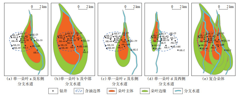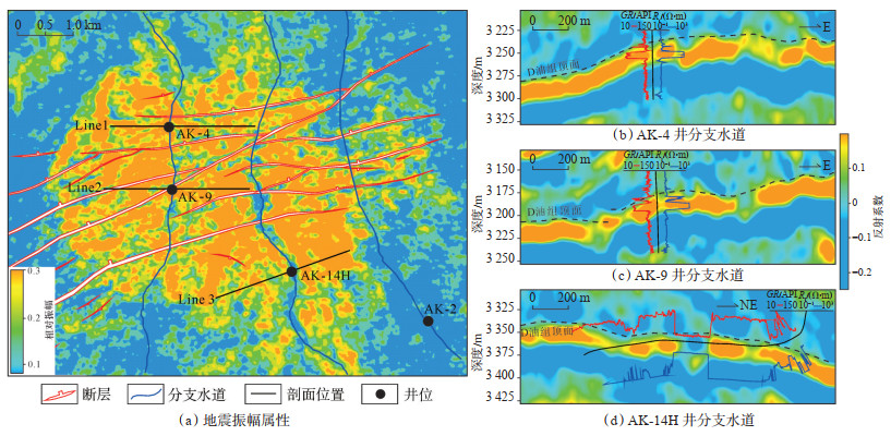 (3) 分支水道:为自上游延伸而来的补给水道或在朵体之上局部发育的分流水道,沿物源方向呈条带状展布。地震属性及钻井资料分析显示,D油组发育3条分支水道(图 4a),其中西侧水道被AK-4井和AK-9井钻遇(图 4b,4c),中部水道被水平井AK-14H井钻遇(图 4d),东侧水道被AK-2井钻遇。西侧水道和中部水道地震属性响应相对明显,东侧水道处于朵叶复合体边缘,且属于油水过渡带,地震属性响应较弱,水道平面几何形态相对不明显。