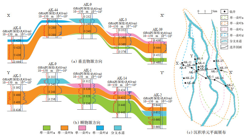 根据单一朵叶和分支水道界限标志,对研究区16口井的单井沉积单元进行了划分,在此基础上,通过搭建多条连井剖面(图 5a,5b),对单井沉积单元进行全区闭合对比,确定了单一朵叶和分支水道的平面展布范围(图 5c)。结果表明,D油组深水复合朵体由4期单一朵叶叠置而成,同时发育3条分支水道。分支水道延伸方向控制单一朵叶展布,并侵蚀改造下伏朵叶单元,水道发育部位砂地比降低、砂体厚度减小、GR曲线齿化特征增强。单一朵叶a分布于D油组东部,受东侧水道控制;单一朵叶b发育规模最大,在D油组全区均稳定分布,受中部水道控制;单一朵叶c和单一朵叶d发育规模较小,均叠覆于单一朵叶b之上,分别位于D油组中东部和西部,并分别受控于东侧水道和西侧水道。