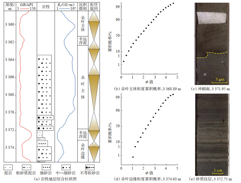 3.1 朵叶主体朵叶主体位于朵叶的中轴部,GR曲线呈箱形或微齿化箱形(图 6a),正-反粒序组合,砂地比高,平均为0.87,砂体厚度大,平均为8.4 m。岩性以黄色细—中粒石英砂岩为主,粒径中值为0.25 mm,粒度累积概率曲线为低斜率直线或微凸弧线(图 6b),以递变悬浮次总体为主,粒度分布范围广,平均分选系数为1.6,分选性中等;发育块状层理、平行层理及正粒序层理,底部可见明显冲刷面(图 6c),少见植物化石。