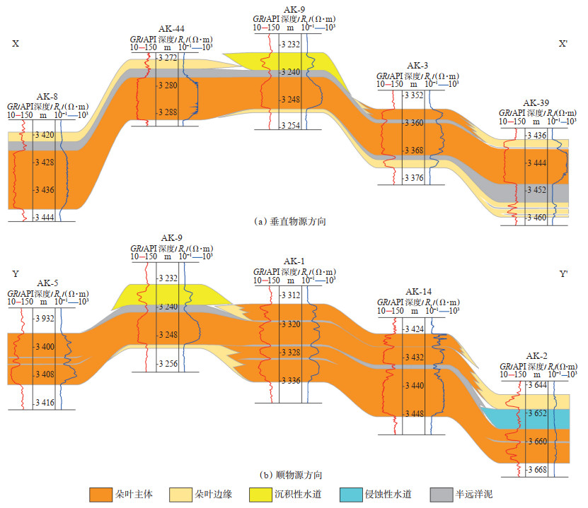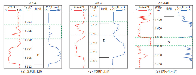 3.4 沉积性水道沉积性水道处于静止或废弃状态,作为沉积场所接受陆源碎屑或半远洋泥的混合沉积,研究区内不同部位沉积充填性质存在一定差异。例如,AK-4井与AK-9井钻遇同一条水道,AK-4井测井响应为GR曲线薄层低幅指形(图 7a),整体为正韵律,而AK-9井则为GR曲线低幅漏斗形(图 7b),指示反韵律,揭示水道充填性质的复杂性。