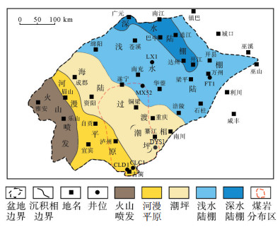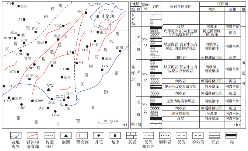 1 地质概况中二叠世末的东吴运动使四川盆地大部分地区整体抬升并暴露于海平面之上,受风化剥蚀作用改造的影响,康滇古陆进一步隆升、扩大,成为四川盆地上二叠统的主要物源区,古地势为南西高、北东低。晚二叠世初,海平面开始间歇性上升,海侵由东至西、自北东向南西方向推进,在川中—川南地区广泛沉积了一套陆相和海陆过渡相含煤地层(图 1a)。川南地区二叠系龙潭组为河泛平原和潮坪沉积,自下而上划分为龙一段至龙三段。其中,龙一段厚度为25~55 m,岩性以砂岩和粉砂岩为主,含煤层;龙二段厚度为25~50 m,底部以砂岩为主,向上过渡为泥岩与煤层薄互层,中部发育一套砂岩,上部岩性主要为厚层泥岩夹粉砂岩和煤层,煤层厚度为1~3 m;龙三段厚度为25~35 m,底部发育砂岩,中上部岩性以泥岩为主夹煤层,煤层厚约2 m(图 1b)。