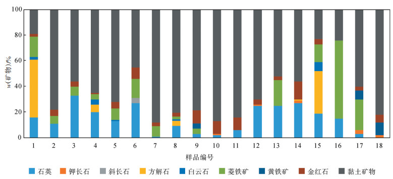 (1)川南地区二叠系龙潭组矿物主要为石英和黏土矿物,其次是菱铁矿,少量黄铁矿、金红石、长石、碳酸盐等矿物。黏土矿物质量分数为19.0%~88.0%,平均为58.0%;石英质量分数为0~33.0%,平均为14.2%;菱铁矿质量分数为0~61.0%,平均为10.6%。