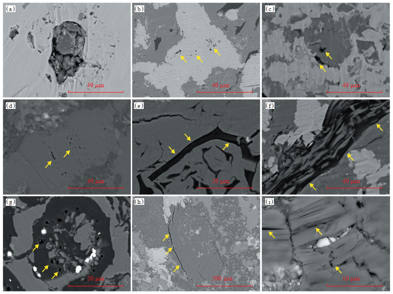 3.1.4 微裂缝微裂缝主要为黏土矿物层间微裂缝、矿物破裂缝及构造缝等类型,多呈网状发育。黏土矿物层间微裂缝的形成主要是由于地层埋深和地层温度增加及地层水转变为碱性,黏土矿物发生脱水转化而析出大量层间水,从而在层间形成微裂隙。研究区龙潭组页岩中共识别出2种黏土矿物形成的层间微裂缝(图 3h,3i):①高岭石层间微裂缝,主要形成于鳞片状高岭石间,孔隙形态多呈平行板状或楔状,缝宽一般介于数纳米到数微米,缝内充填菱铁矿;②伊蒙混层层间微裂缝是研究层段最为发育的孔-缝类型,龙潭组不同岩性微裂缝的发育程度不同。伊利石-蒙脱石集合体间发育大量层间孔隙和裂缝,呈线状或三角状,缝宽一般为数纳米到数百纳米,连通性较好。