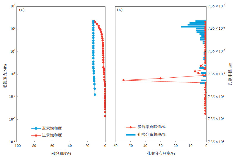 3.2 储集空间结构川南地区龙潭组泥页岩压汞测试结果(图 4)显示,压汞曲线进汞饱和度均未达到20%,说明该类页岩极为致密,渗透率小,汞很难被压入孔隙中。进汞曲线平台段位置靠上,整体斜率偏大,表明排驱压力高,孔喉半径小。分选系数为5.16,该值大于3,说明喉道分散。通过孔喉分布频率可看出,孔隙分布状态表现为以微孔为主,介孔次之,孔径普遍小于73.5 nm,对渗透率贡献较大的孔隙半径约为1 μm。