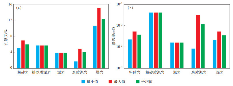 利用脉冲衰减法对川南地区龙潭组不同岩石类型进行的渗透率测试结果显示,炭质泥岩样品的渗透率为0.000 84~0.030 83 mD,平均为0.011 59 mD;泥岩样品的渗透率为0.001 59 mD;粉砂质泥岩样品的渗透率为0.040 82 mD;粉砂岩样品的渗透率为0.002 20~0.005 33 mD,平均为0.003 77 mD;煤岩样品的渗透率为0.002 10~0.005 20 mD,平均为0.003 50 mD(图 6b)。