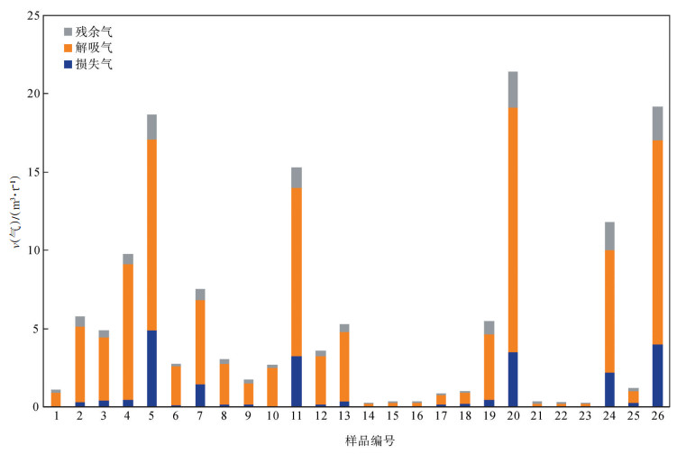 川南地区CLD1井1 746.68~1 829.70 m段龙潭组样品(26个)现场解析实验分析结果显示,总含气质量体积为0.23~21.44 m3/t,平均为5.59 m3/t。其中,煤岩含气量明显高于其他岩性,总含气质量体积为7.56~21.44 m3/t,平均为15.66 m3/t;泥岩总含气质量体积为0.34~2.76 m3/t,平均为1.47 m3/t;炭质泥岩总含气量比泥岩高,总含气质量体积为1.78~9.77 m3/t,平均为4.88 m3/t;泥质粉砂岩、粉砂岩及细砂岩含气量低,总含气质量体积为0.23~1.02 m3/t,平均为0.60 m3/t(图 7)。总体而言,煤岩含气量最高,炭质泥岩与泥岩次之,泥质粉砂岩、粉砂岩及细砂岩含气量最低。