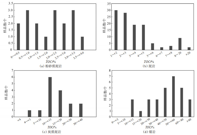 4.1.3 有机质丰度川南地区龙潭组主要为一套陆相含煤系地层,烃源岩主要包括暗色粉砂质泥岩、泥岩、炭质泥岩及煤岩。根据CLD1井样品统计结果,研究区龙潭组烃源岩TOC为0.20%~81.38%,平均为12.12 %,且不同岩性TOC含量差异较大。其中,粉砂质泥岩TOC为0.47%~3.59%,平均为1.90%,总体含量偏低,呈双峰型分布,峰值区间分别为0~1.5% 与2.0%~4.0%(图 8a),TOC含量较高的样品主要来自河漫滩与河漫沼泽,且常与泥岩、炭质泥岩呈互层状分布;泥岩TOC为0.20%~27.54%,平均为3.89%,主要为0.50%~5.00%,少量泥岩TOC大于8.00%(图 8b);炭质泥岩TOC为3.46%~34.16%,平均为12.71%,主要为10.00%~30.00%,最高可达34.16%(图 8c);煤岩TOC为10.57%~81.38%,平均为48.31%,主要为40.00%~80.00%,平均可达48.31%(图 8d)。
