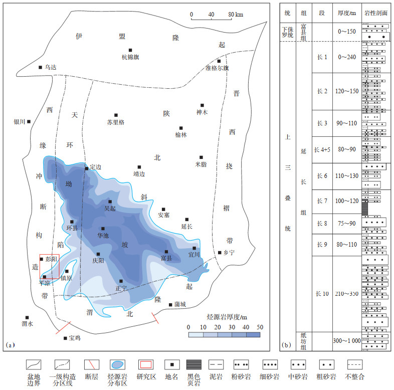 下载原图 图 1 鄂尔多斯盆地平凉北地区构造位置(a)及上三叠统岩性地层综合柱状图(b) Fig. 1 Tectonic location(a) and stratigraphic column of Upper Triassic(b) in northern Pingliang area, Ordos Basin |