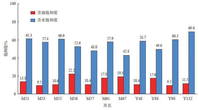 根据研究区试油井段含油、含水饱和度参数的统计,发现该区长8段储层含油饱和度普遍低于20.0%,平均含油饱和度仅为13.9%,含水饱和度普遍高于50.0%,平均值达57.3%(图 2),属于典型的低含油饱和度油藏,且单井产量低,相邻井油、水产能差异大。从空间分布来看,原油集中在长8段顶部,纵向上具有上油下水、边底水较活跃的特征,油藏在平面上零星分布。