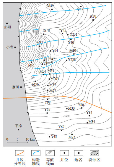 在微观尺度上,M53井区油藏含油饱和度低与油气聚集区的低幅度构造密切相关。赵彦德等[21]的研究认为,鄂尔多斯盆地西缘构造雏形形成于印支期的南北向构造挤压作用,在燕山期,天环坳陷南段进一步受到北东东—南西西向挤压而形成一系列低幅度鼻状构造(图 4)。平凉北地区在早白垩世末期为主成藏期,成藏时期晚于低幅度构造形成时期[4]。构造形态对油气成藏存具有一定控制作用,根据油气成藏动力学理论,油气在地层孔隙中的运移是动力(含水储层中受到的净浮力)克服阻力(毛细管阻力)的过程[22]。在静水条件下,单位面积油柱在含水储层中受到的净浮力为