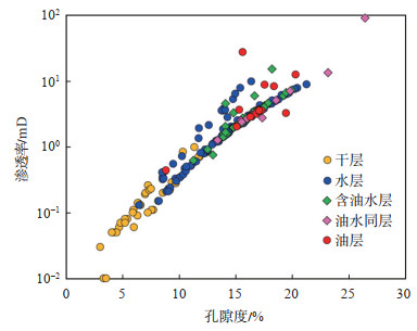 通过对研究区储层含油性与物性特征的相关性进行探讨,发现储层含油性与孔渗特征具有较强的相关性,其中含油层(包括油层、差油层、油水同层、含油水层)的孔渗条件较好,水层的孔渗分布较宽,但整体比含油层的物性条件稍差,干层的物性条件最差(图 5)。