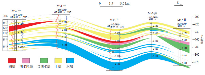 从空间分布特征来看,研究区长8段储层相邻井区同一套砂体的含油性差异与其物性特征的变化具有一定规律(图 6)。以M53井区为例,相比于邻近的M51井和M56井而言,M53井处于地势相对较低的区域,但其含油性明显优于另外2口井。在M53井长813小层中,油层的渗透率(K油层)为7.03 mD,而M5 1井的同层位砂层渗透率为0.01 mD,可见该地区油气的平面分布主要受到渗透率的影响,所以不能仅仅依据构造特征选取探勘目标。从流体分布和物性特征来看,长8段储层具有K油层> K油水同层 > K含油水层 > K水层 > K干层的特征。这意味着储层物性非均质性对油藏的油水分布具有较大影响,在物性条件较好的前提下,储层非均质程度越高,对应油藏的含油饱和度越低。研究区长8段储层为辫状河水下分流河道沉积,虽然砂体总厚度大,但在河道迁移摆动过程中,岩性和物性均会发生变化,导致砂体在垂向上物性变化快,不同物性特征的层段叠置,非均质性相对较强。从M53井含油层段可看出,在一个近20 m厚的单砂体内,由于垂向上的物性非均质性强,导致了含油性的显著变化,从而大大降低了油藏的含油饱和度(图 6)。同时,平凉北地区油气供应量均较小,充注动力不足,这导致对于大套厚层砂体而言,仅在连通且渗透率相对较大的层段赋存油气,而渗透率相对较小的砂岩层段则以含水为主。另外,垂向上储层渗透率非均质性强也是平凉北地区油水分异差的重要原因。