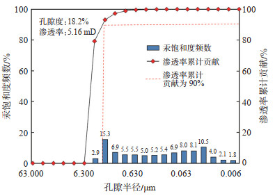 通过高压压汞法分析单一样品的孔隙半径与其对渗透率的累计贡献的关系,发现部分样品虽然孔渗数据显示其物性较好,但90%以上的渗透率贡献均来自相对较大的孔喉,该类孔喉占比小于10%,绝大部分孔喉对油气没有渗流作用(图 7)。