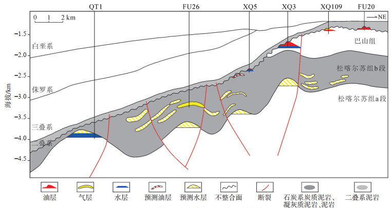 从过QT1,FU26和XQ3等井的典型剖面(图 5)可知,准噶尔盆地阜东斜坡石炭系内幕地层具有自东向西逐渐遭受剥蚀的特征,西部地层老,东部地层相对较新。晚石炭系巴山组地层主要分布在凸起区高部位,巴山组以中低频杂乱反射的爆发相火山岩为主,前期在XQ3井、XQ9井、XQ1井等井区已经发现油气藏,勘探程度较高。巴山组下伏的松喀尔苏组b段地层全区广泛分布,爆发相主要沿断裂带分布,发育较为局限,该层段主要为强振幅连续反射的溢流相安山岩和炭质泥岩、凝灰质泥岩和泥岩的互层,溢流相呈层状展布,纵向叠置、横向连片发育,与溢流相紧贴的炭质泥岩、凝灰质泥岩、泥岩已经被证实是该区的主力优质烃源岩,因此溢流相成藏条件非常优越,是重点预测的岩相。松喀尔苏组a段埋深较大,从地震剖面上看,主要发育中低频杂乱反射的爆发相岩体,该类岩相顶部与松喀尔苏组b段烃源岩直接对接,成藏条件同样优越,虽然埋深较大,但基质孔发育、储层物性好,勘探潜力大。