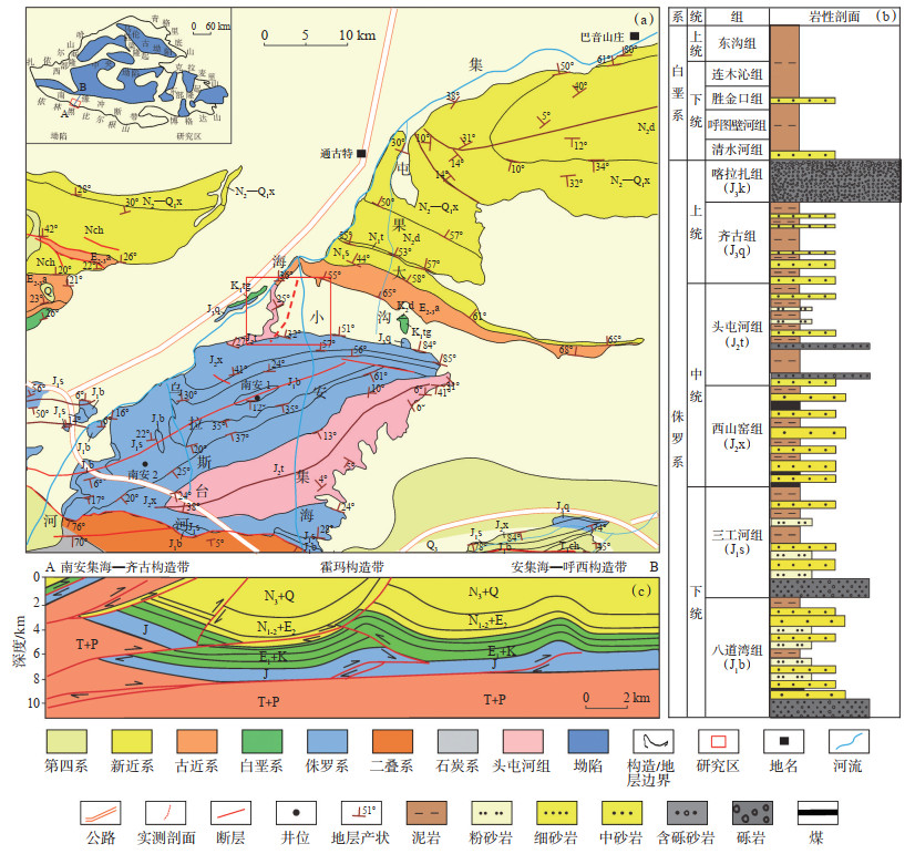 准噶尔盆地南缘位于北天山山前,东西长500 km,南北宽40~60 km,面积约为2.1×104 km2,可划分为西部的四棵树凹陷,东部的阜康断裂带,北部的霍玛背斜带和山前的齐古断褶带4个二级构造单元[33](图 1)。本区经历了晚海西、印支-燕山、喜马拉雅期等3个构造期不同构造体系的叠加,形成了3个逆冲褶皱带,发育了一系列的背斜构造[17-18]。南安集海河剖面位于准南山前第一构造带,在四棵树凹陷和齐古断褶带交界处,处于南安集海背斜南翼,位于沙湾县安集海镇以西,距奎屯市直线距离约40 km,距沙湾县直线距离约50 km。该区出露三叠系—第四系的6套地层,其中侏罗系自下而上可划分为下侏罗统八道湾组和三工河组、中侏罗统西山窑组和头屯河组、上侏罗统齐古组和喀拉扎组。