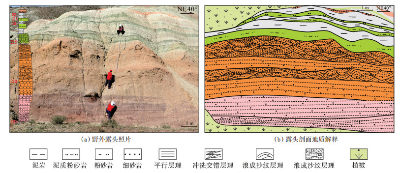 前缘席状砂主要由片状、条带状、分选好、砂质纯净的细砂岩和粉砂岩组成。由于湖水的冲刷和淘洗作用使泥质被带走,仅砂质沉积物被保存下来,砂体颗粒较分流河道砂体细,粒度分布曲线显示为二段式,主要发育浪成沙纹层理。该类型砂体可分为分流河道末端席状砂和浪控席状砂[40]2种类型。分流河道末端席状砂是由于末梢水下分流河道水动力减弱,而湖水的顶托作用不断增强,最后沉积物在末端扩散形成。这类席状砂在露头上体现为一系列呈黄色条带状的粉—细砂岩,其颗粒较细,分选较好,沉积构造不发育,总体上向湖及两侧呈变薄的趋势,通常发育在水下分流河道的两侧及末端,横向上延伸不远,最长约20 m。浪控席状砂是最大湖平面时期水下分流河道主体被湖浪改造形成的。浅水三角洲沉积时湖盆水体较浅,湖面季节性、周期性的频繁波动导致湖岸线大范围迁移,波浪作用导致水下分流河道席状化,砂体发生横向迁移并连接成片形成环状分布的前缘席状砂,厚度一般不超过2 m,具模糊的河道特征,发育大量的浪成沙纹层理,其底部有时还可见河道冲刷痕迹(图 9)。
