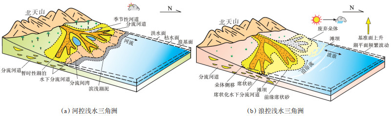 4 沉积模式中侏罗统头屯河组沉积期,准噶尔盆地南安集海地区地形平缓,水体较浅,该区经历了半干旱—干旱—湿润的气候演变过程,其间湖平面频繁波动,湖岸线大范围迁移导致不同水位下砂体的分布存在明显差异[42-43]。根据南安集海河剖面头屯河组的沉积特征、沉积相类型,建立了头屯河组河控浅水三角洲和浪控浅水三角洲的沉积模式(图 11)。