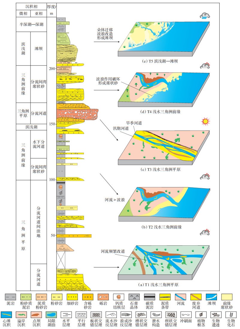 5 沉积演化根据南安集海河剖面头屯河组沉积微相垂向演变特征,将该地区头屯河组沉积演化过程划分为5个阶段,分别用T1—T5表示。T1—T2阶段发育于头屯河组一段,T3—T4阶段发育于头屯河组二段,T5阶段发育于头屯河组三段。从头屯河组沉积早期到晚期,岩性逐渐变细,沉积模式由河控浅水三角洲向浪控浅水三角洲和滨浅湖相演化(图 12)。