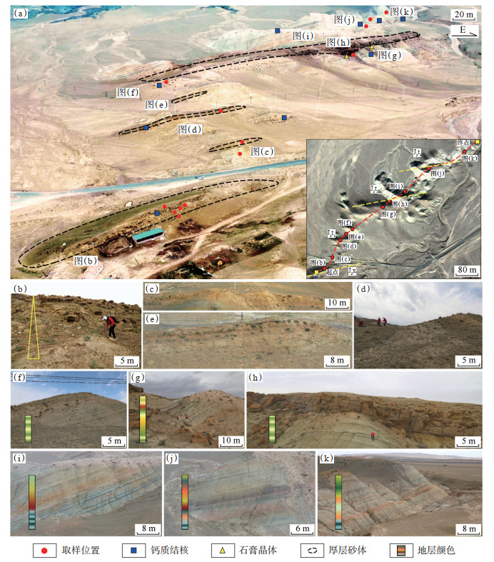 下载原图 图 2 准噶尔盆地南安集海河剖面中侏罗统头屯河组地层颜色及整体特征 (a)航拍的头屯河组剖面;(b)头一段底部河道砂体;(c)头一段中部厚层砂体;(d)头一段中部泥岩沉积;(e)头一段中部厚层砂体;(f)头一段中部地层;(g)头一段中上部地层;(h)头一段顶部地层;(i)头二段底部地层;(j)头二段顶部地层;(k)头三段地层。 Fig. 2 Stratum color and overall characteristics of Middle Jurassic Toutunhe Formation in southern Anjihai river outcrops, southern margin of Junggar Basin |