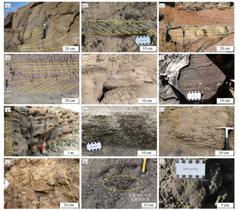 2.2 沉积构造沉积构造类型是指示水动力条件、沉积速度、沉积环境和沉积相类型的重要标志。研究区砂岩中广泛发育大型槽状交错层理、板状交错层理、平行层理、冲洗交错层理和浪成沙纹层理(图 3a—3e)。槽状交错层理层系宽度为3~5 m,常与板状交错层理、平行层理共生。平行层理剥开面上可见明显的剥离线理构造(图 3f),砂岩底部常常发育侵蚀冲刷面,这些构造指示一种较强水动力条件下,水浅流急的河流环境。冲洗交错层理是水体来回冲刷形成的,其层系界面呈楔状低角度相交,层系顶部被切蚀,常见于滨浅湖滩坝环境中。浪成沙纹层理在头屯河组二、三段细砂岩中大量发育,具有前积层倾向相反,内部纹层呈“人”字形的特征,指示波浪作用的成因。头屯河组地层在野外的典型识别标志是风化形成的蜂窝状砂岩(图 3g)。头屯河组粉砂岩和泥岩中发育水平层理、块状层理、流水沙纹层理、泄水构造和生物遗迹(图 3h—3l)。水平层理、流水沙纹层理是在水体较浅、水动力较弱的环境下由悬浮物沉积而成,主要发育于分流间洼地。泄水构造只发育在局部地层,是由松散沉积物内孔隙水快速泄出而形成,一般认为是三角洲前缘的重要标志[34]。黑色泥岩中发育植物叶片、植物根系及炭屑,这是典型的沼泽环境特征。在粉砂岩中可见大量的生物钻孔和生物活动遗迹,其形态不规则,判断为浅水生物活动造成。