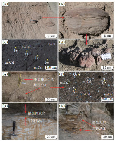 根据对比吴道祥等[36]在淮北平原的研究,从头屯河组钙质结核的分布情况来看,Ⅰ类钙质结核是随着湖水的大量蒸发,碳酸盐矿物不断析出并胶结成核,主要发育于湖盆浅水环境中。Ⅱ类钙质结核则是地下水经土壤淋滤作用形成于沼泽湿地或小型局限湖泊中。2类钙质结核均指示了地势平坦、气候炎热、暴露氧化的环境。此外在头屯河组一段底部,发现大量石膏晶体,沿层面或在砂岩裂缝中充填发育(图 4g,4h),是在极端干旱环境下湖水大量蒸发而形成的一类矿物。